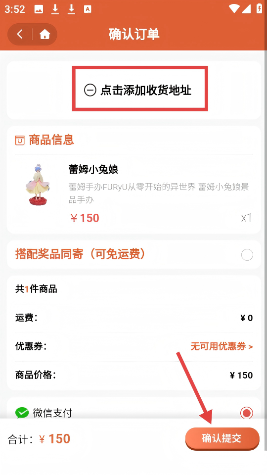 4、在确认订单页面,点击【添加收货地址】添加地址后,点击【确认提交】按钮。