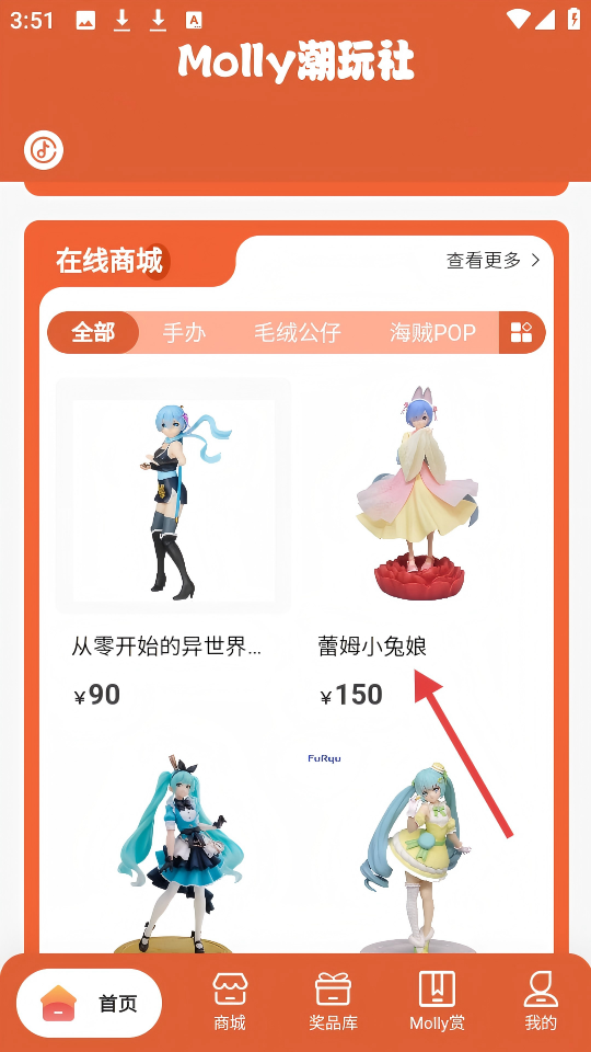 1、在Molly潮玩社在线商城页面,点击【蕾姆小兔娘】手办,进入商品详情页。