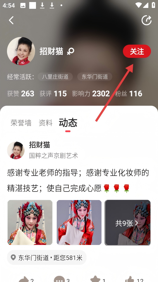 4、在【招财猫】的用户主页,点击红色的【关注】按钮即可关注该用户。