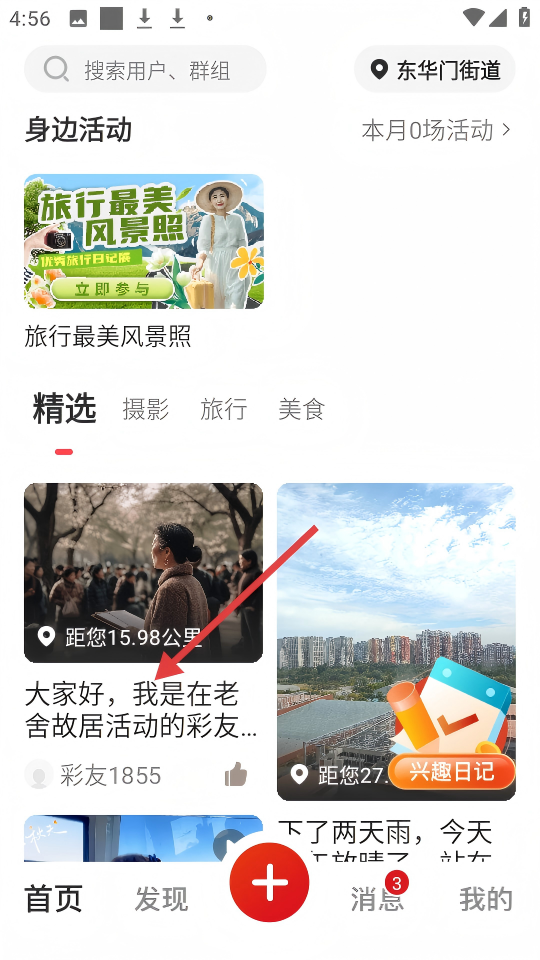1、在发现页面看到感兴趣的内容如【大家好,我是在老舍故居活动的彩友…】,可点击进入查看详情。