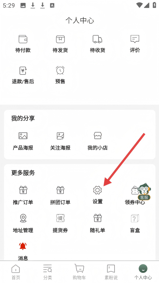 2、在【个人中心】页面,点击【更多服务】里的【设置】。