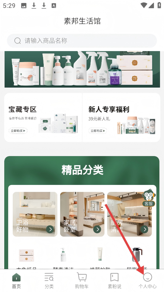 1、在【素邦生活馆】首页,点击右下角【个人中心】。