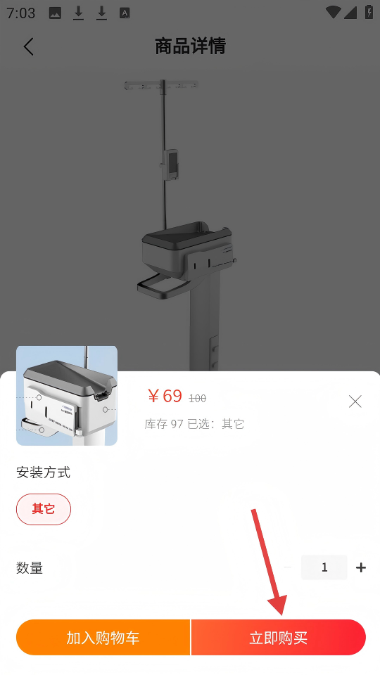 2、在【商品详情】页,点击【立即购买】按钮,进入购买选择页面。