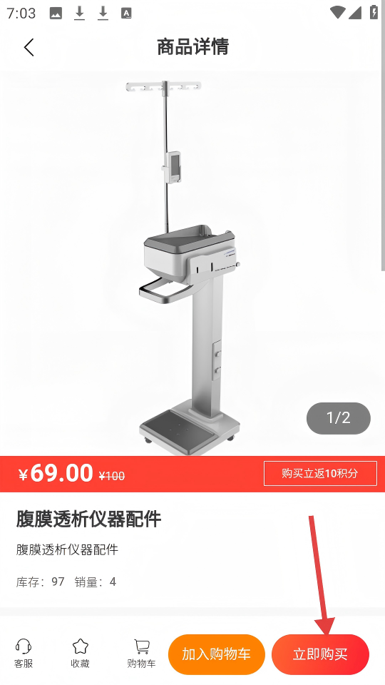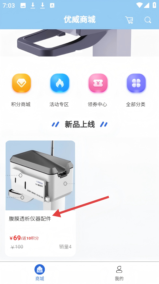 1、在【优威商城】页面,点击【腹膜透析仪器配件】商品,进入商品详情页。