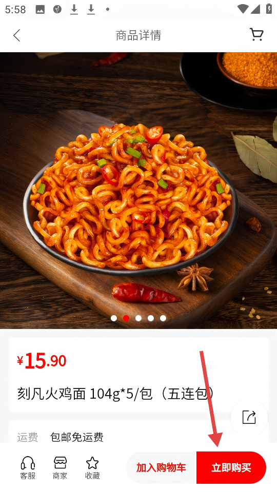 3、在刻凡火鸡面商品详情页,点击【立即购买】按钮,可进行购买操作。