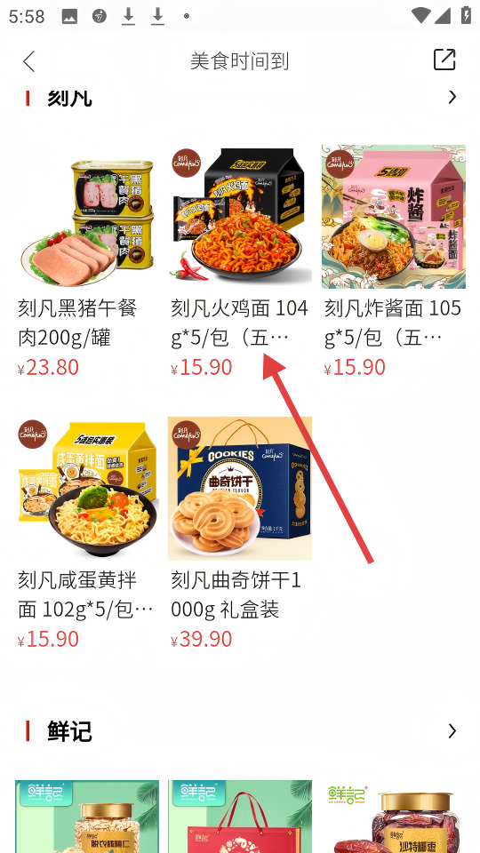 2、在零食商品页面,点击刻凡火鸡面104g*5包(五…)商品,进入其详情页。