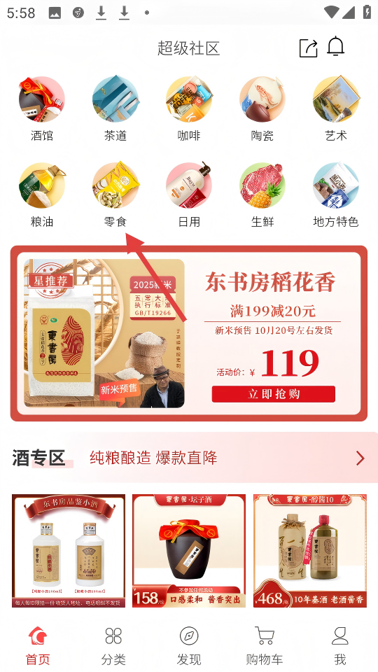 1、在超级社区首页,点击【零食】分类,进入零食商品页面。