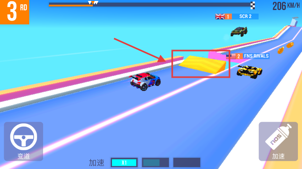 1、遇到赛道上的黄色跳跃坡时,要及时变道驶入,借助坡的弹跳力获得空中优势,拉开与对手的距离。