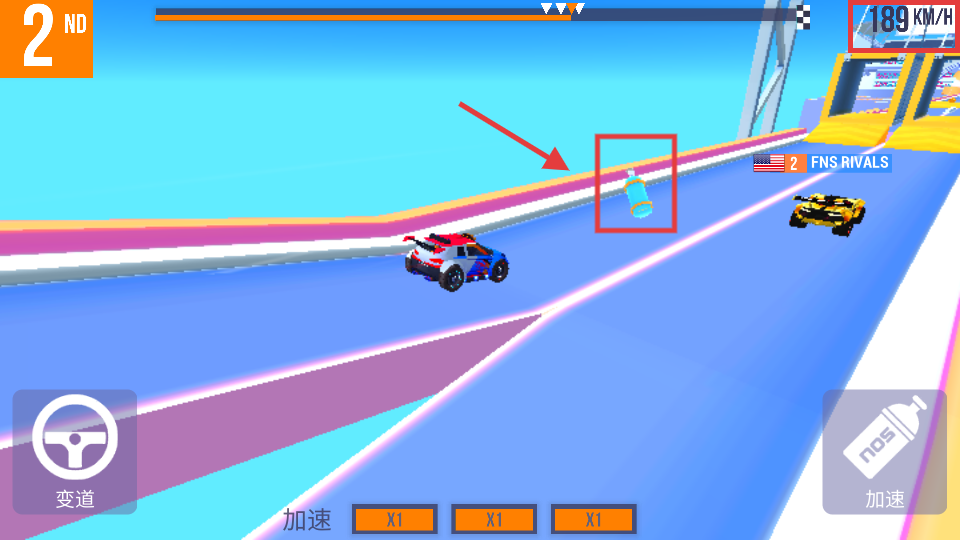2、赛道上出现蓝色加速道具时,优先变道获取,使用后可短时间大幅提升车速,助力超越前方车辆。
