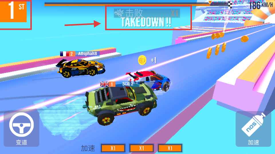 3、在比赛中尝试碰撞对手触发TAKEDOWN效果,成功击败对手可提升排名,同时注意保持自身车速稳定。