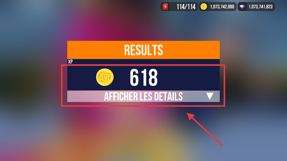 4、比赛结束后,可点击【AFFICHER-LES-DETAILS】查看详细结算信息,了解获得的XP和金币奖励,分析比赛表现。
