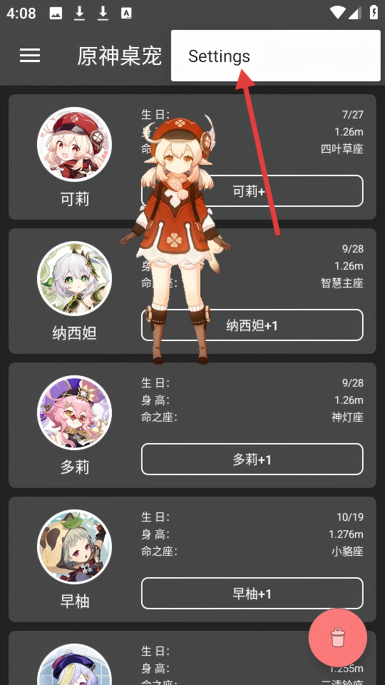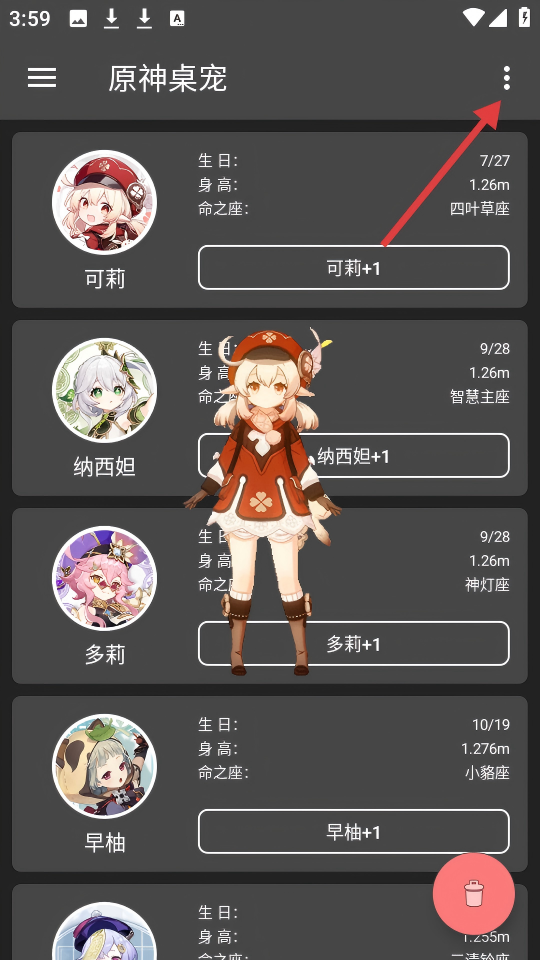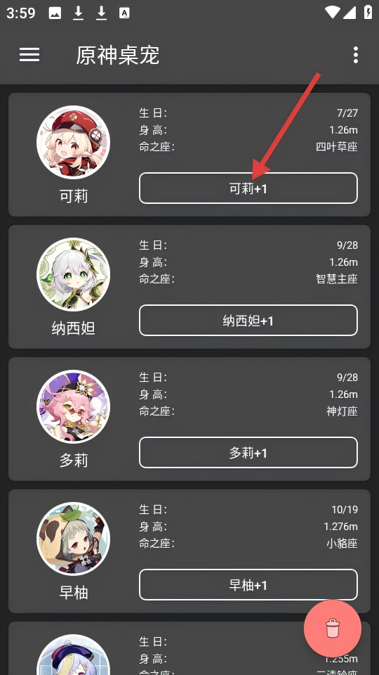 1、点击角色可莉右侧的【可莉+1】按钮,可进行相关操作。