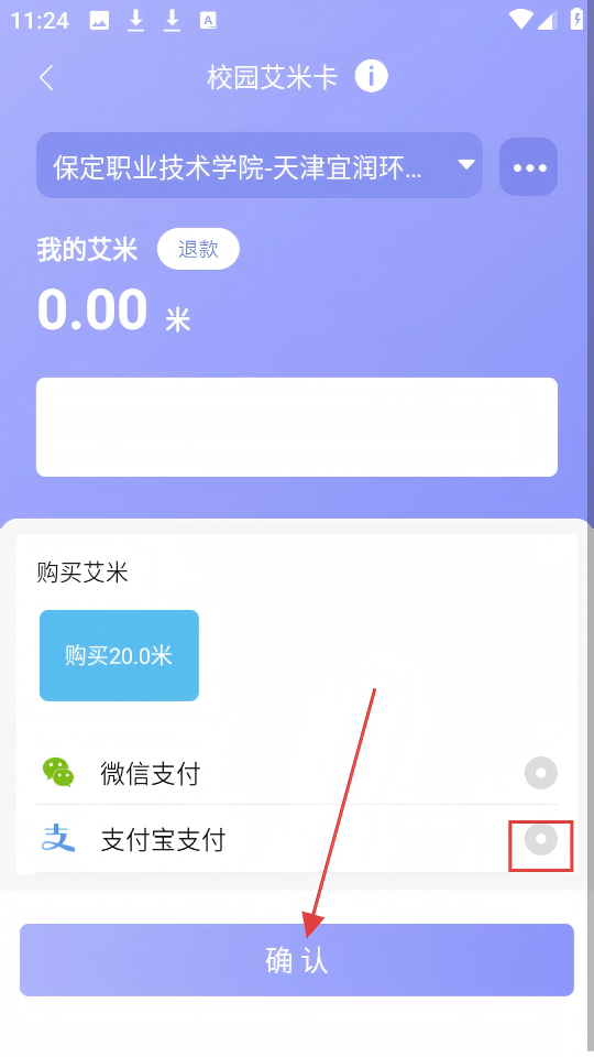 2、在校园艾米卡购买页面,选择支付方式后点击【确认】可进入付款环节。