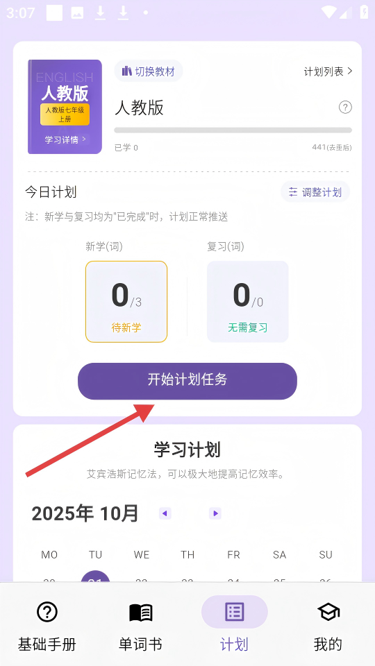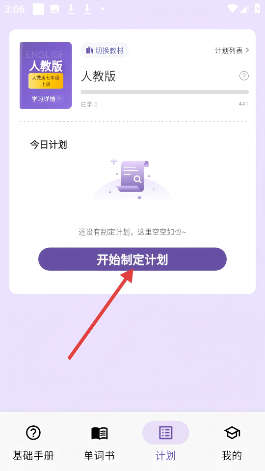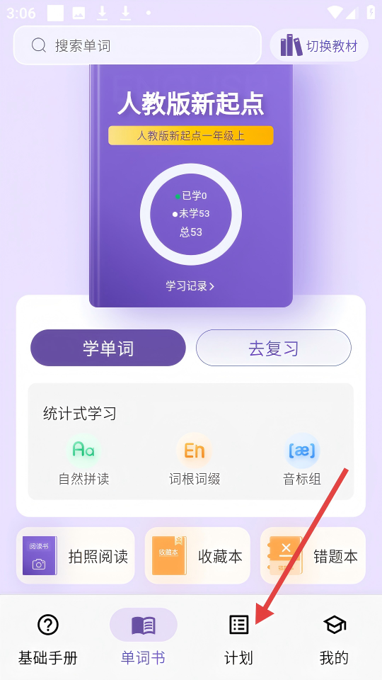 1、在单词书页面,点击底部【计划】,进入计划页面。