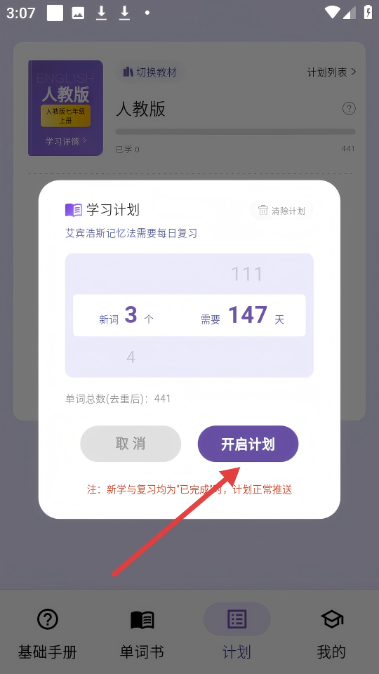 3、在学习计划弹窗中,选择好学习计划点击【开启计划】,开启学习计划。