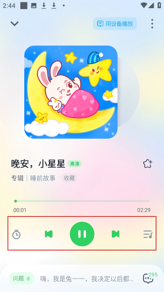4、在晚安,小星星播放页面,可通过下方控制栏进行播放、暂停等操作。