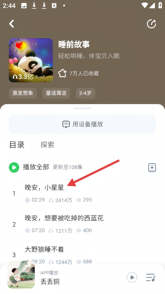 3、在睡前故事专辑目录页,点击【晚安,小星星】,进入该音频播放页面。