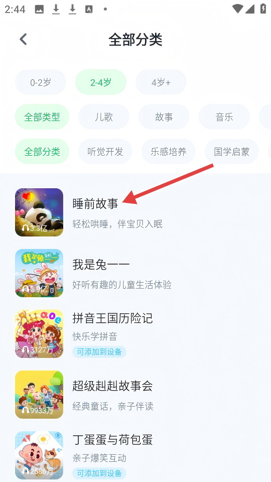 2、在全部分类页面,点击【睡前故事】,进入睡前故事专辑目录页。