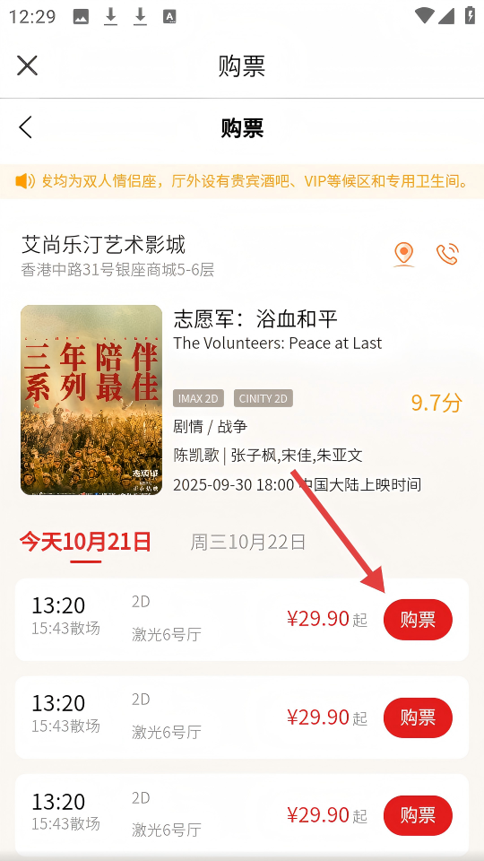 2、在购票页面,选择【志愿军:浴血和平】的场次后,点击对应场次的【购票】按钮。
