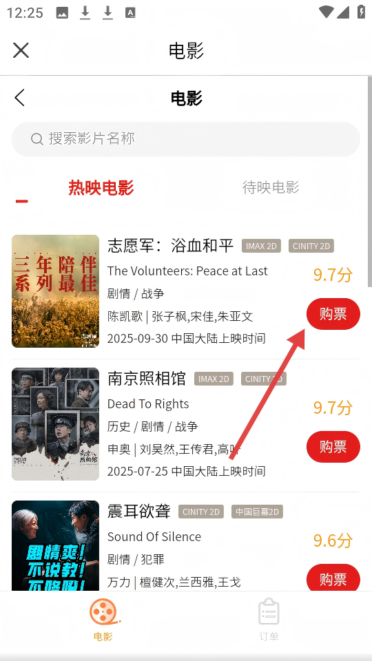 4、在热映电影列表中,找到【志愿军:浴血和平】,点击右侧【购票】按钮。
