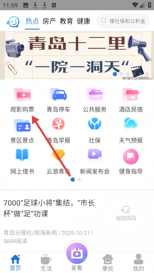 1、在首页,点击【观影购票】图标,进入电影购票相关页面。