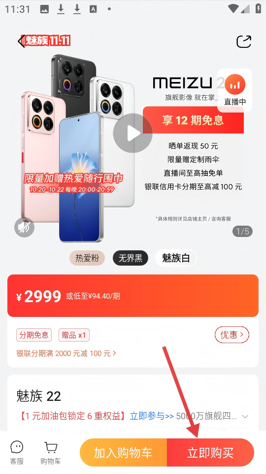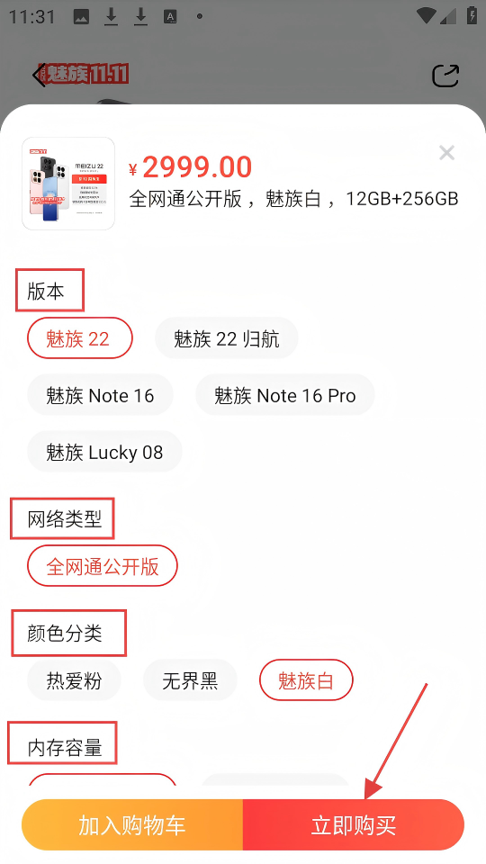3、在魅族22商品详情页,点击【立即购买】,可进入商品规格选择环节。