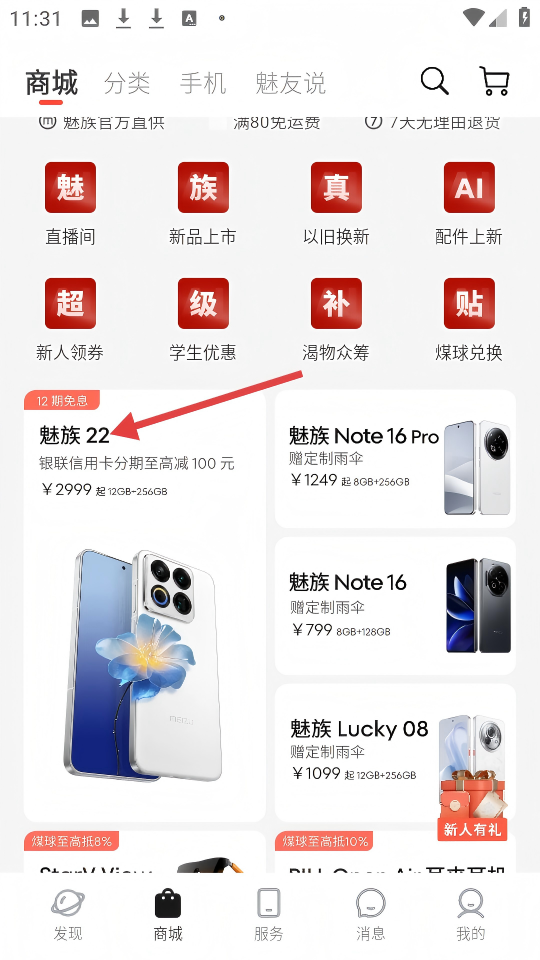 2、在商城页面,点击【魅族22】商品卡片,可进入该商品详情页。