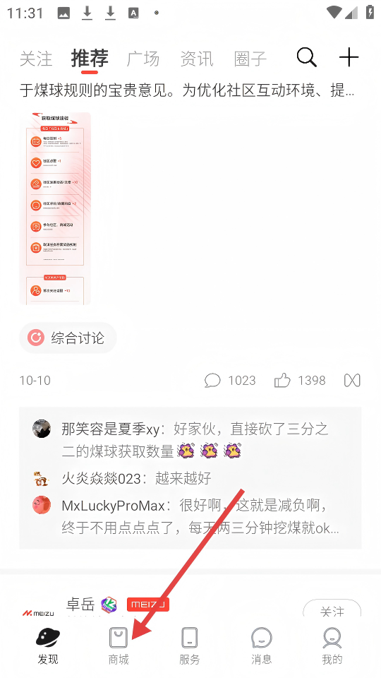 1、在发现页面,点击底部【商城】按钮,可进入商城页面。