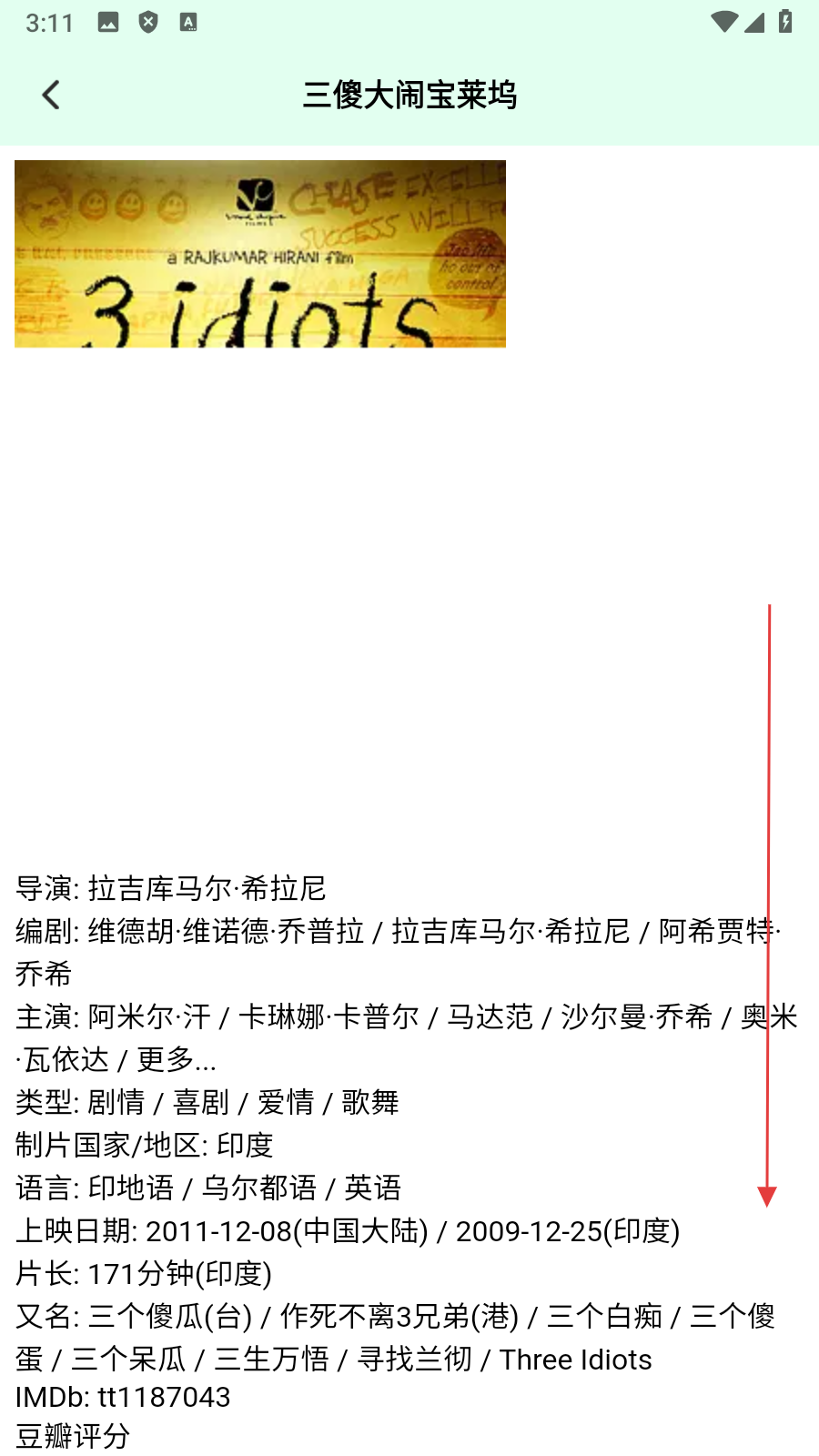 3、在电影详情页面,可以查看导演、主演、类型等基本信息,然后【向下滑动屏幕】。