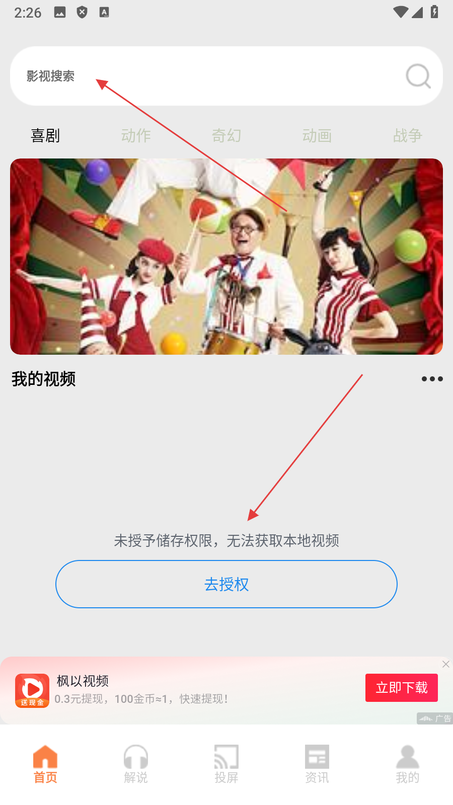1、进入首页,可【搜索影视】,按分类筛选内容,给我的视频【授权以获取本地视频】,开启影视浏览之旅。
