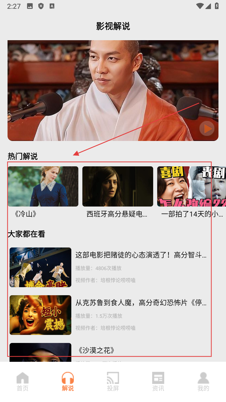 2、进入解说界面,查看【热门解说和推荐视频】,了解影视剧情,享受影视解说的精彩内容。