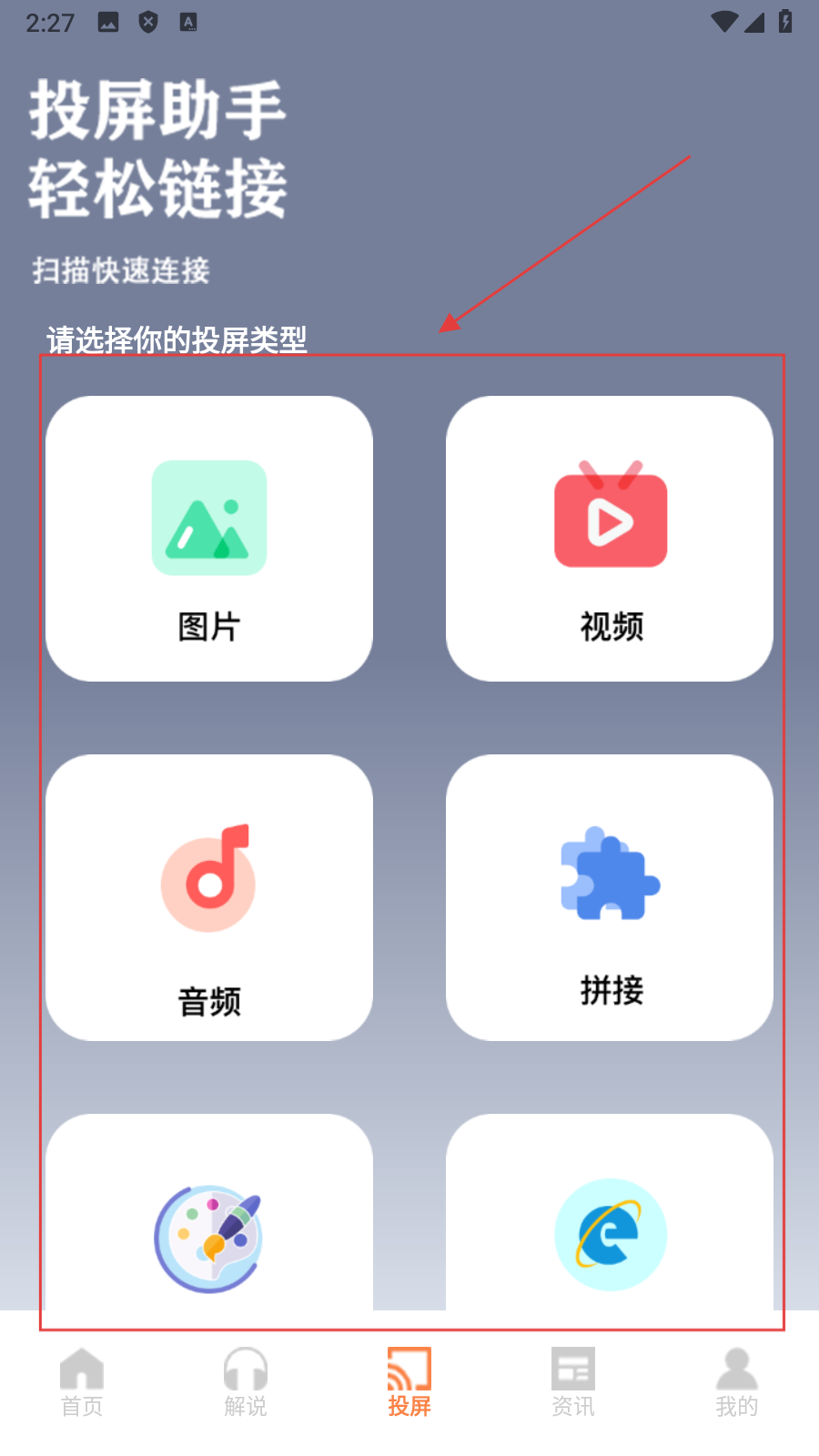 3、进入投屏界面,选择【图片、视频】等投屏类型,轻松链接设备,实现便捷投屏播放。