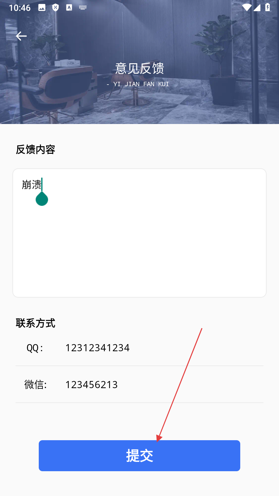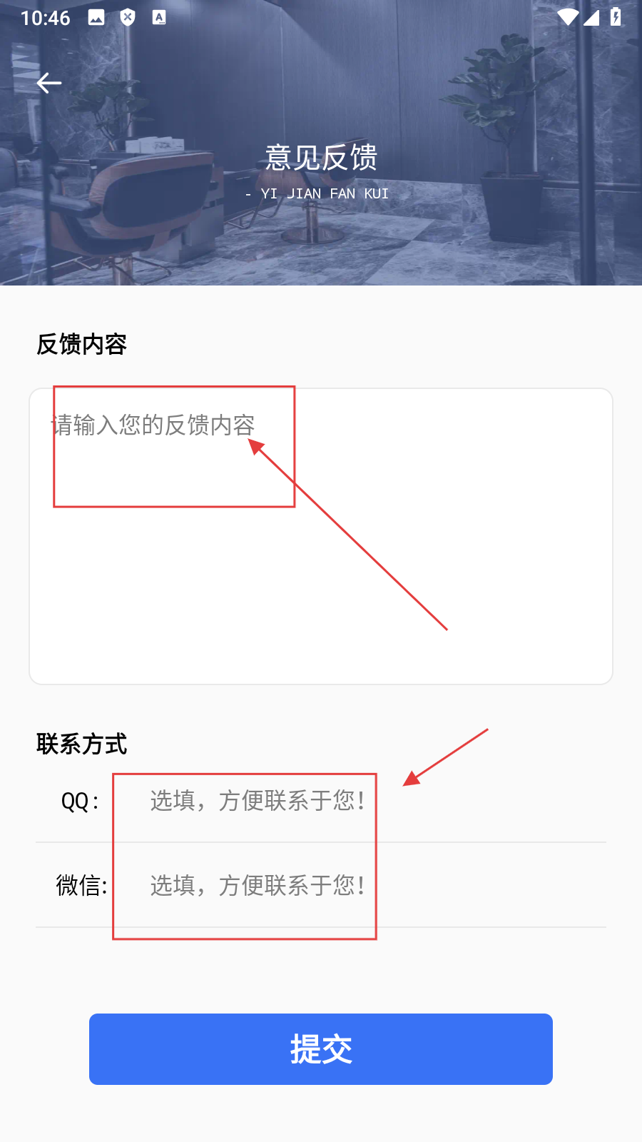 3、在意见反馈页面填写【反馈内容及QQ、微信等联系方式】。