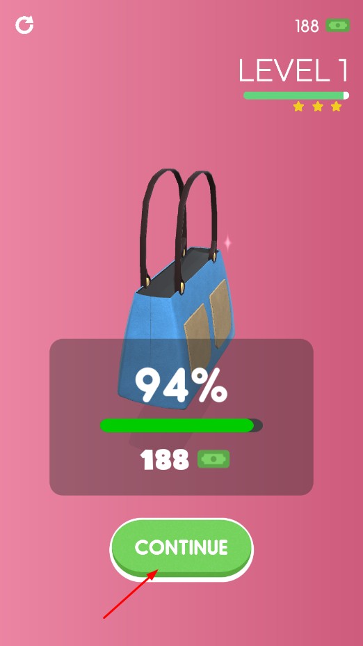 4、当包包还原度达到要求,获得相应奖励后,点击【CONTINUE】按钮,可继续后续的包包绘制挑战。