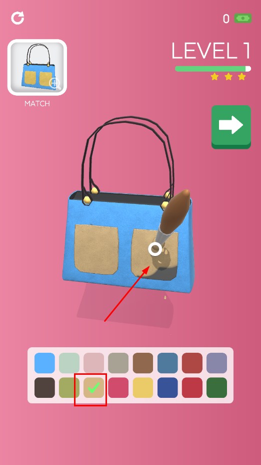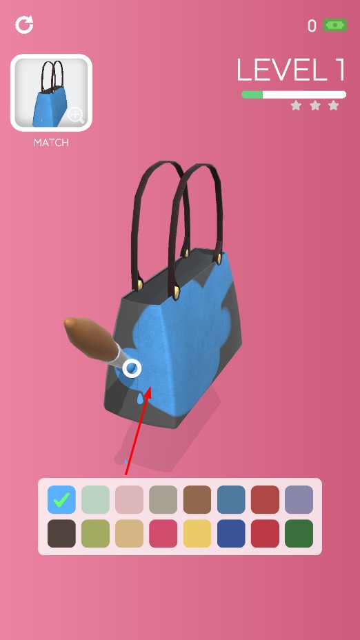 1、根据左上角目标包包的样式,从下方调色板选取对应颜色,用画笔为包包上色。