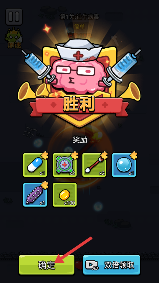 4、战斗胜利后点击【确定】,领取奖励,完成第1关挑战。