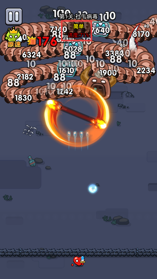 3、在第1关社牛病毒战斗中,攻击病毒,不断推进进度,继续战斗。