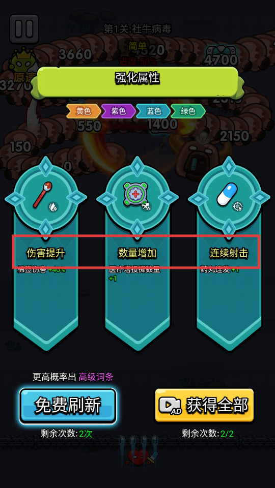 2、选择强化属性,如【伤害提升】【数量增加】【连续射击】,提升战斗效果。