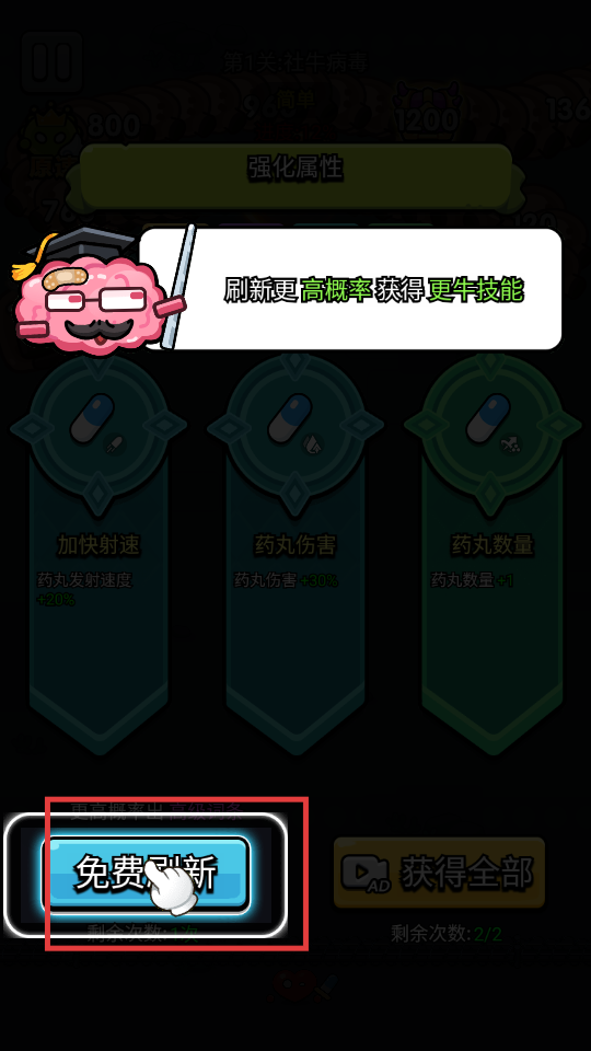 1、点击【免费刷新】,提高获得更牛技能的概率,增强战斗能力。