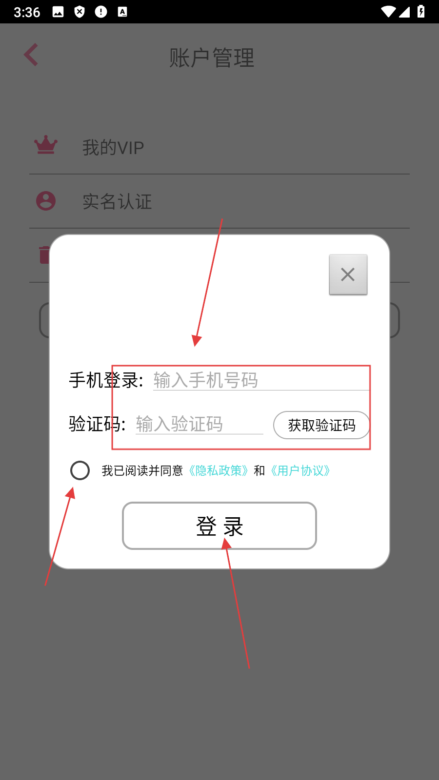 4、在登录窗口【填写信息、勾选协议】后点击【登录】,即可完成账号登录操作。