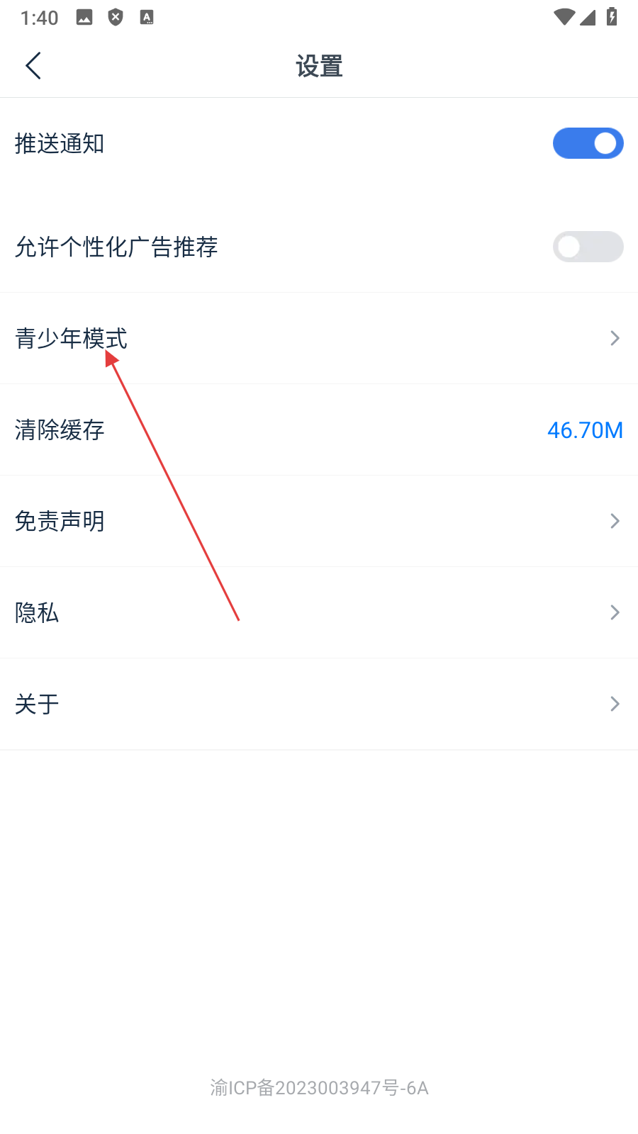 3、在设置页面,点击【青少年模式】,进入青少年模式设置页面。