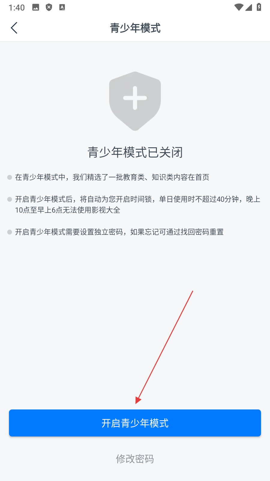 4、在青少年模式设置页面,点击【开启青少年模式】,即可开启青少年模式。