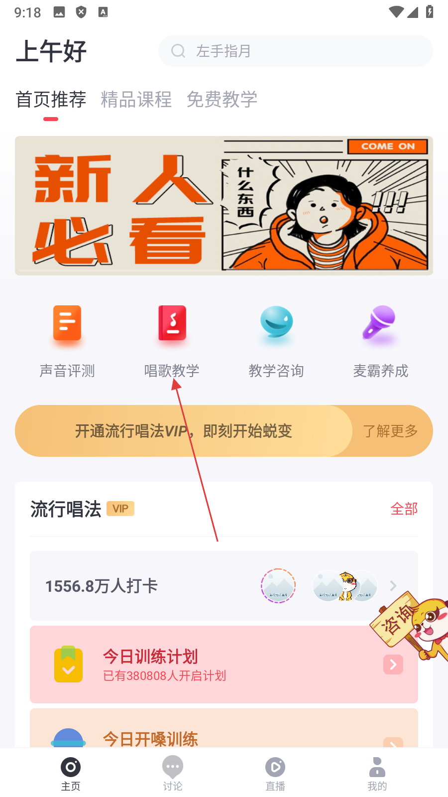 1、点击【唱歌教学】,进入练声练唱页面。