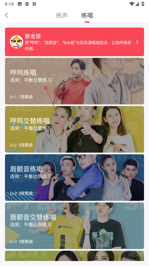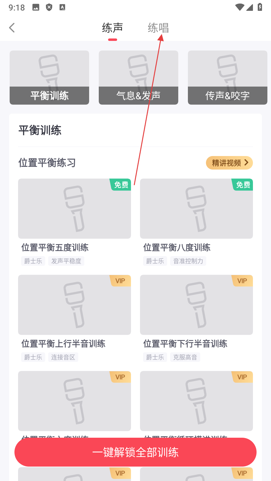 2、在练声练唱页面,点击【练唱】,进入练唱课程列表页面。