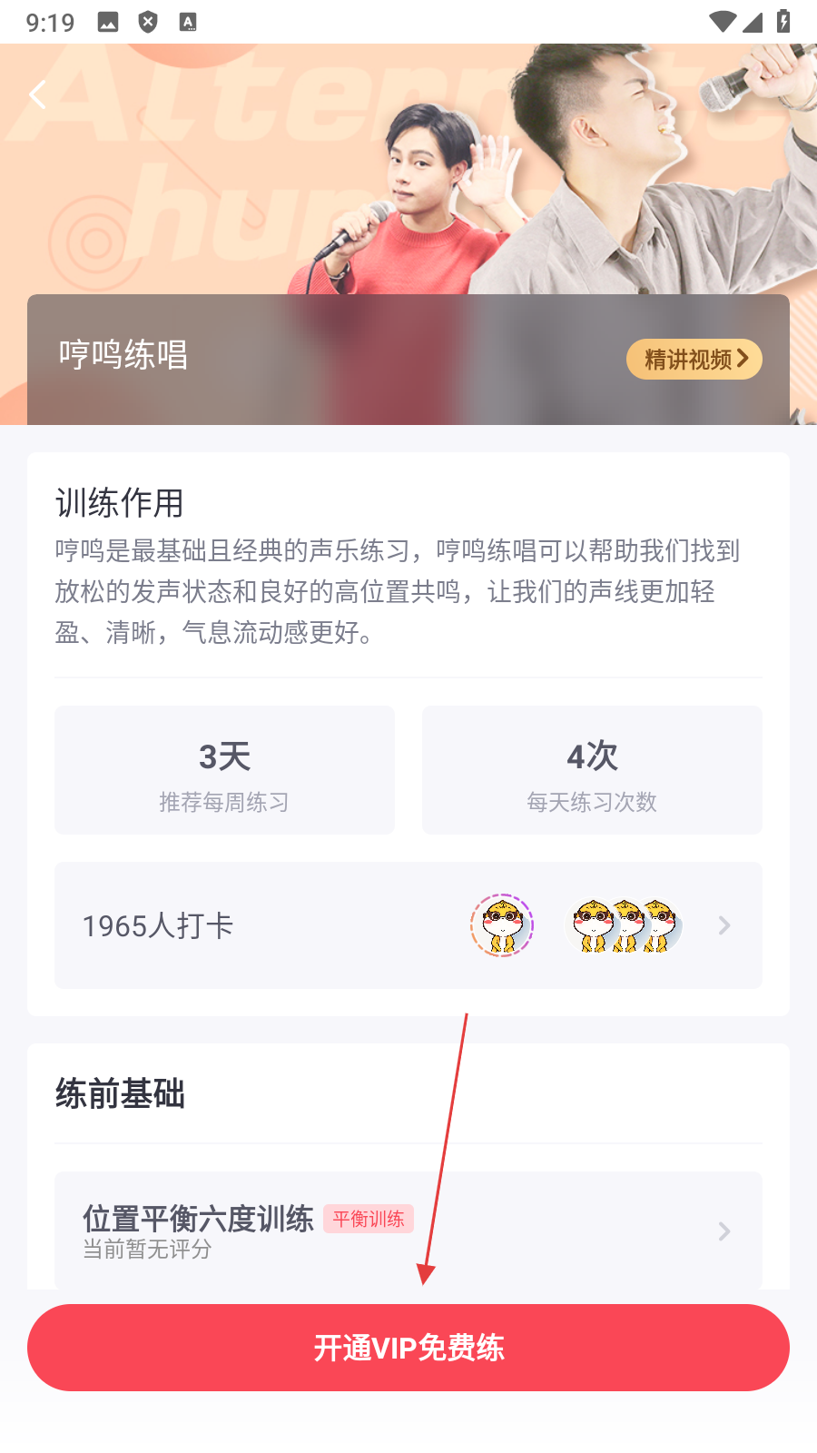 4、在哼鸣练唱详情页面,点击【开通VIP免费练】,即可开启练唱训练。
