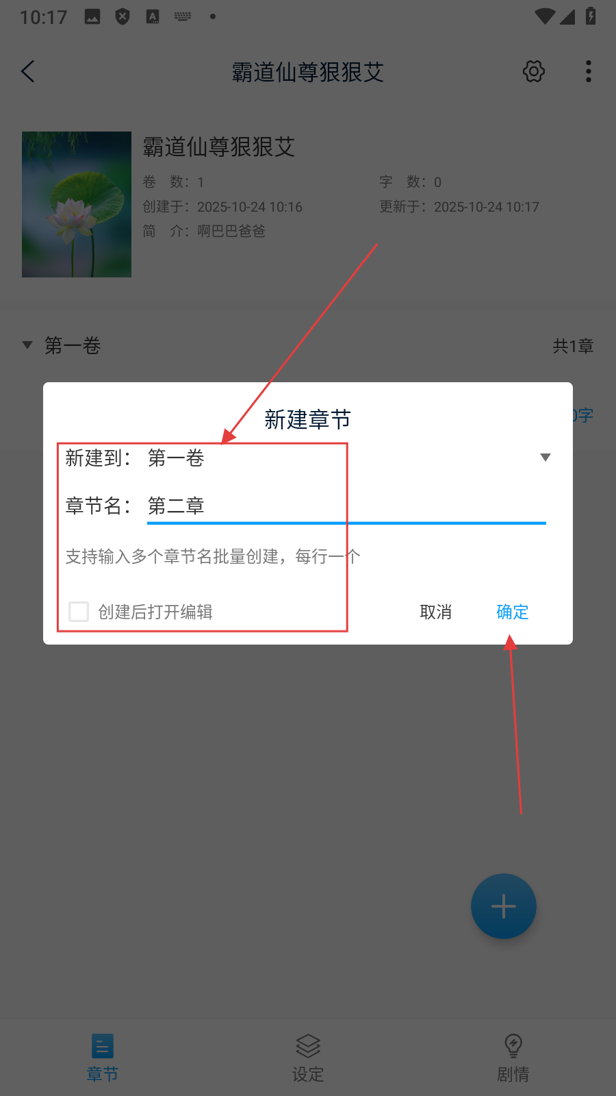 4、在新建章节页面,设置【章节名等信息】后点击【确定】,即可完成章节添加操作。