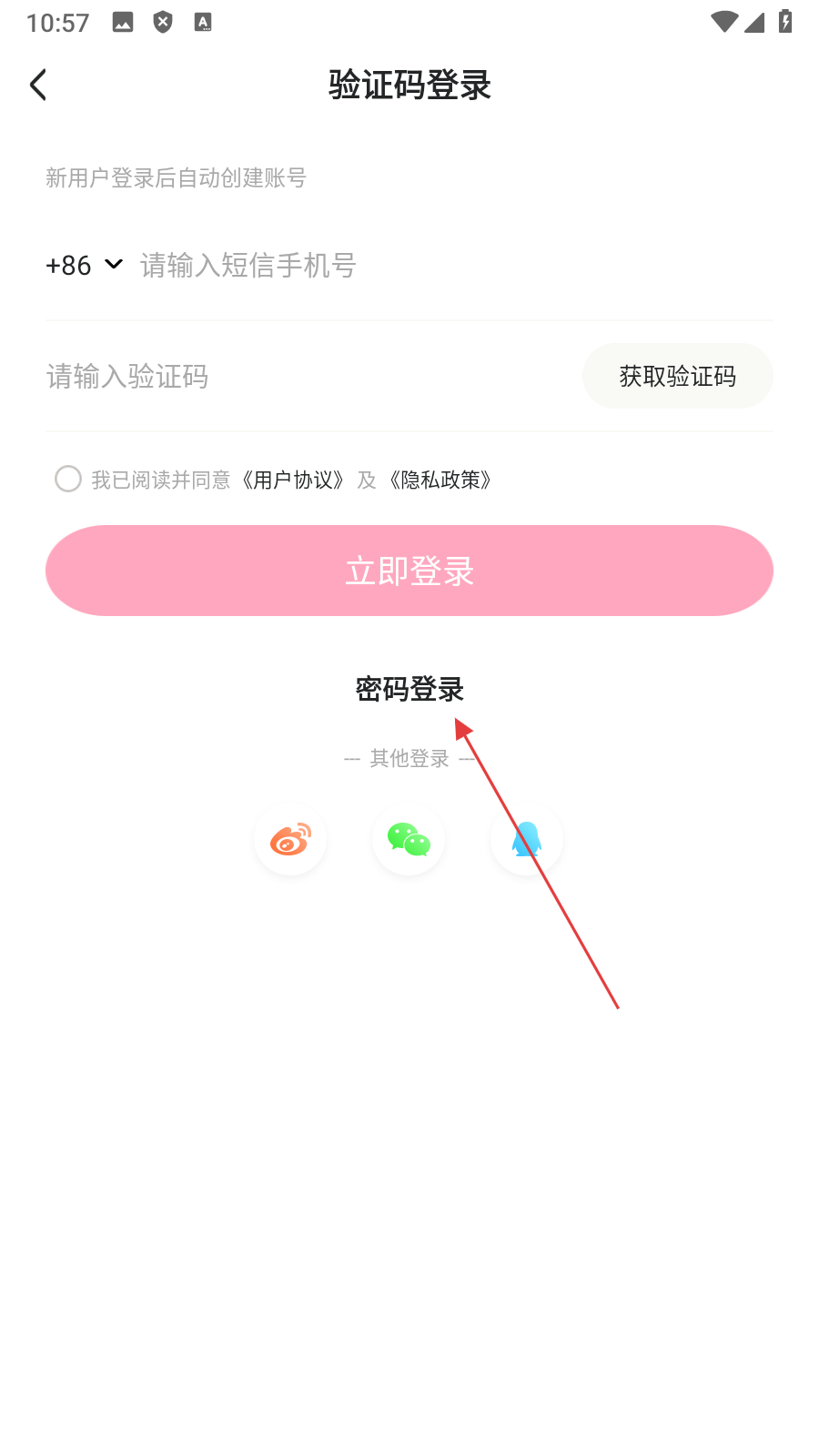 3、在登录选择页面,点击【密码登录】,进入密码登录页面。