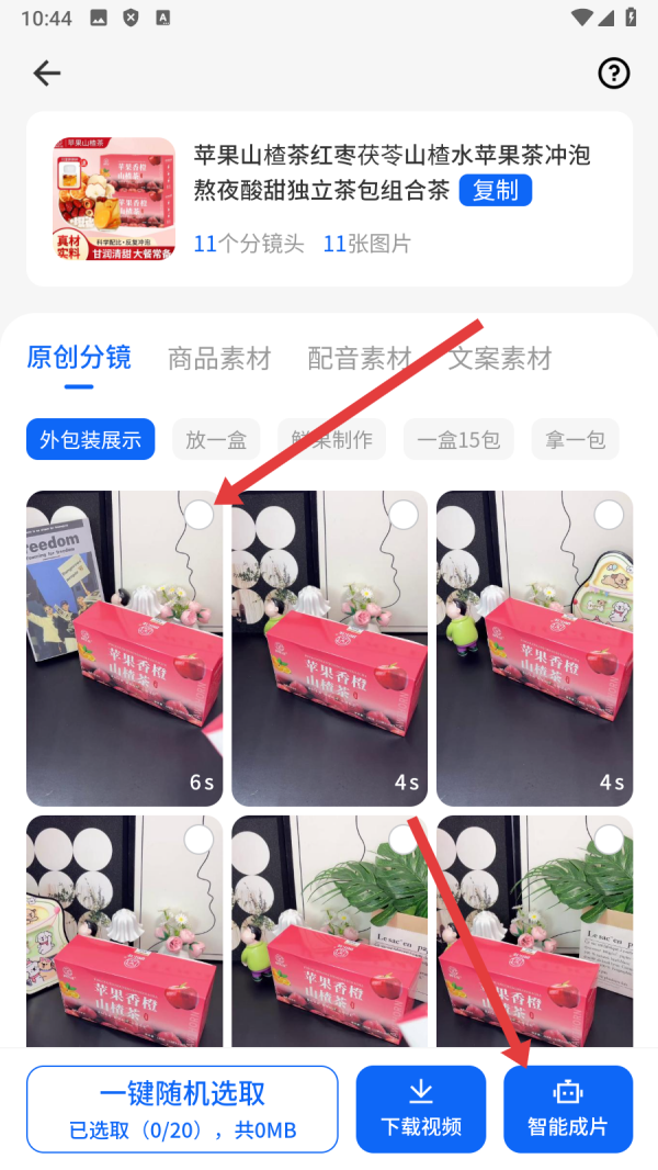 3、在素材详情页面,【选择图片】后点击【智能成片】,进入智能成片设置页面。