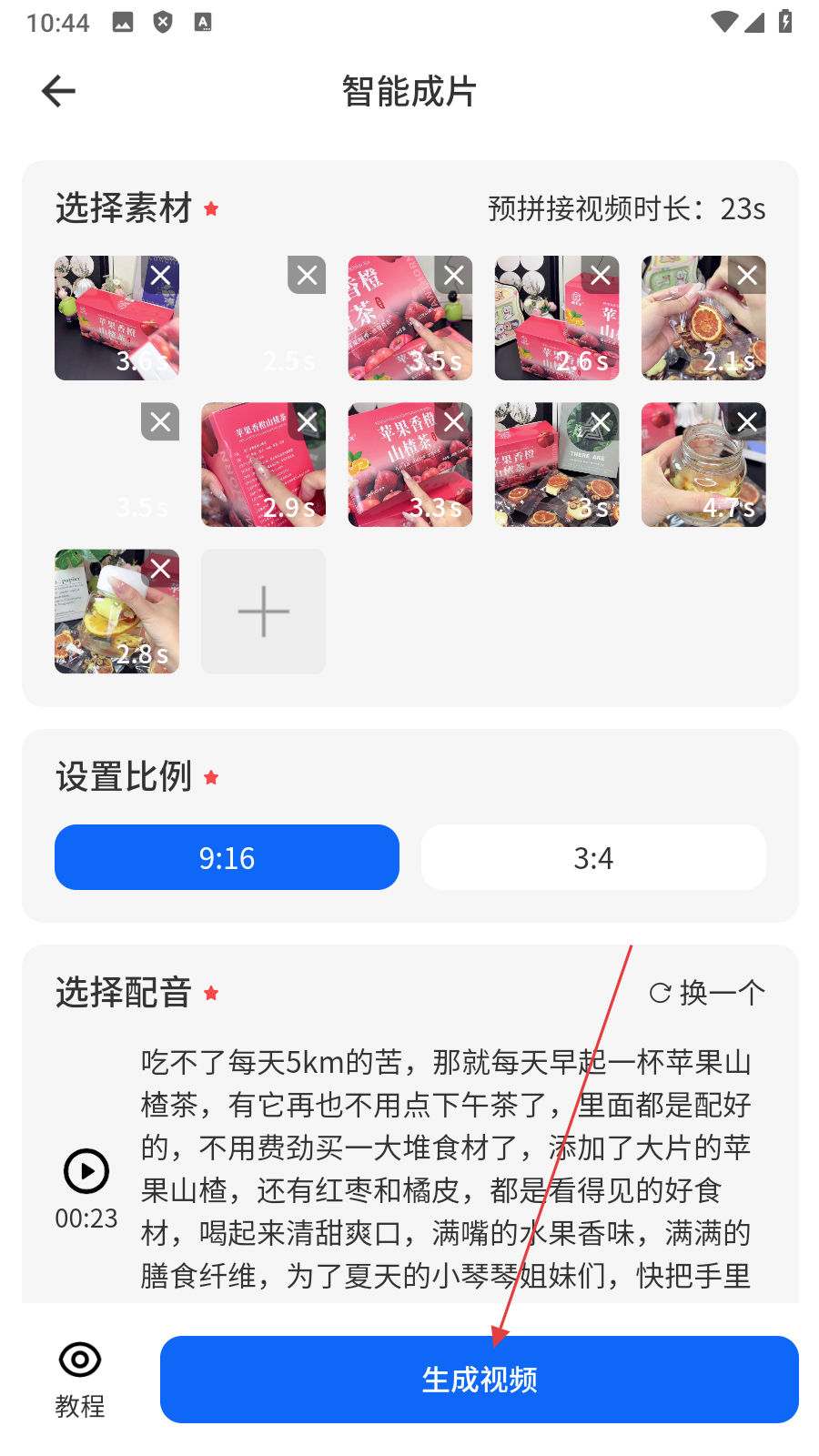 4、在智能成片设置页面,点击【生成视频】,即可完成视频生成操作。