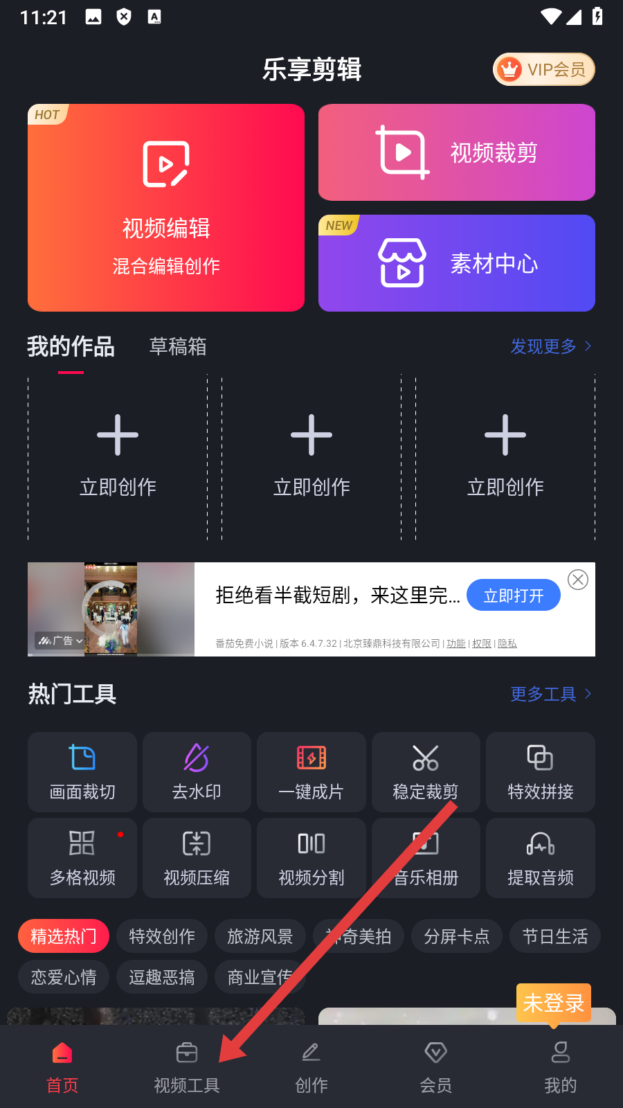 3、首页设有创作中心,点击立即创作可添加视频、图片素材,草稿箱存放项目文件,方便用户随时修改创作,使用便捷。